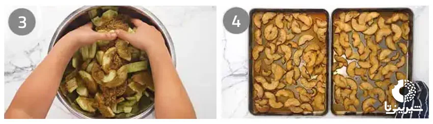 سیب ها را پوست کنده و به صورت عمودی برش دهید. سپس آن ها را به صورت تکه مکعب های نیم سانتی برش بزنید و بعد در کاسه بریزید و آن را با شکر قهوهای، شکر سفید، نمک، آب لیمو، آرد، جوز هندی، و پودر دارچین مخلوط کنید.