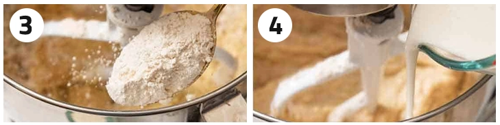 بعد آرد را به ترکیب درون همزن اضافه میکنیم و با دور متوسط ادامه می دهیم، این کار را تا زمانی انجام می دهیم که مواد به خوبی با هم ترکیب شده باشند.